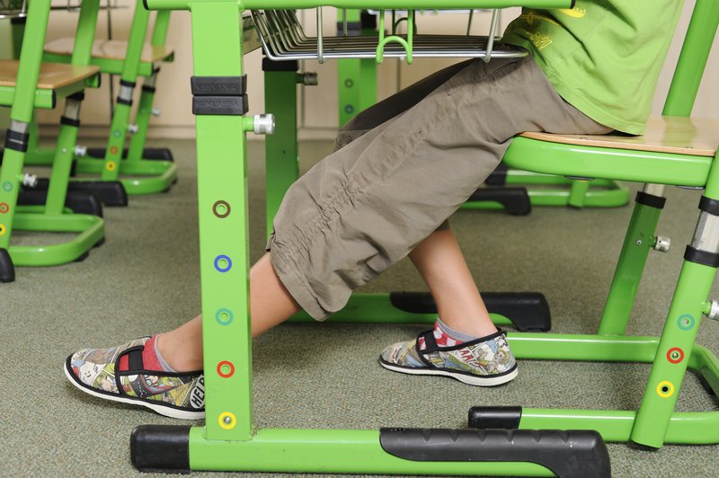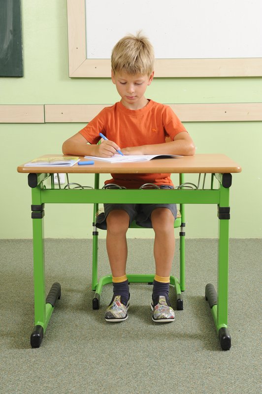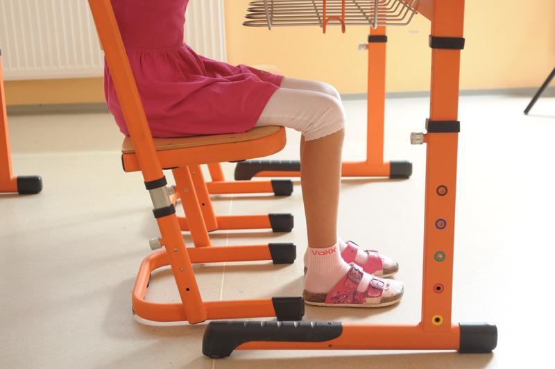 Z bočného pohľadu vidíme, že dieťa sedí na celej stoličke – obe chodidlá sú celou plochou opreté o podlahu, päty sú pod kolenami. Dôležitá je aj vzdialenosť hlavy od podložky a vystretý chrbát.